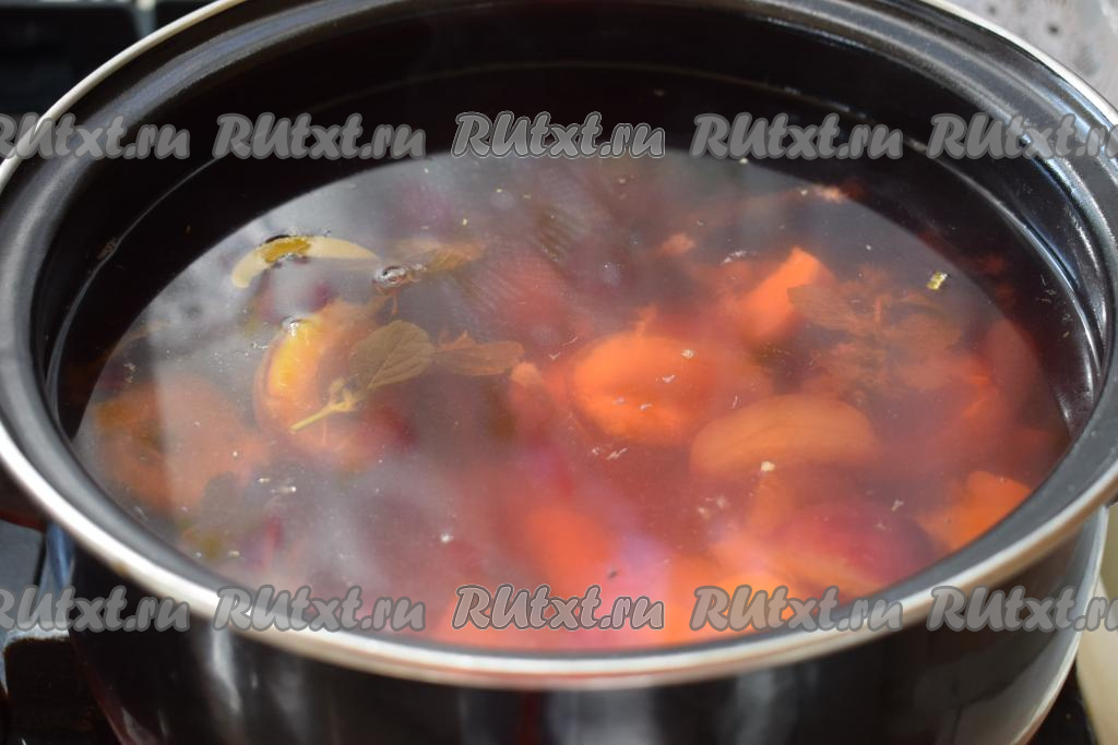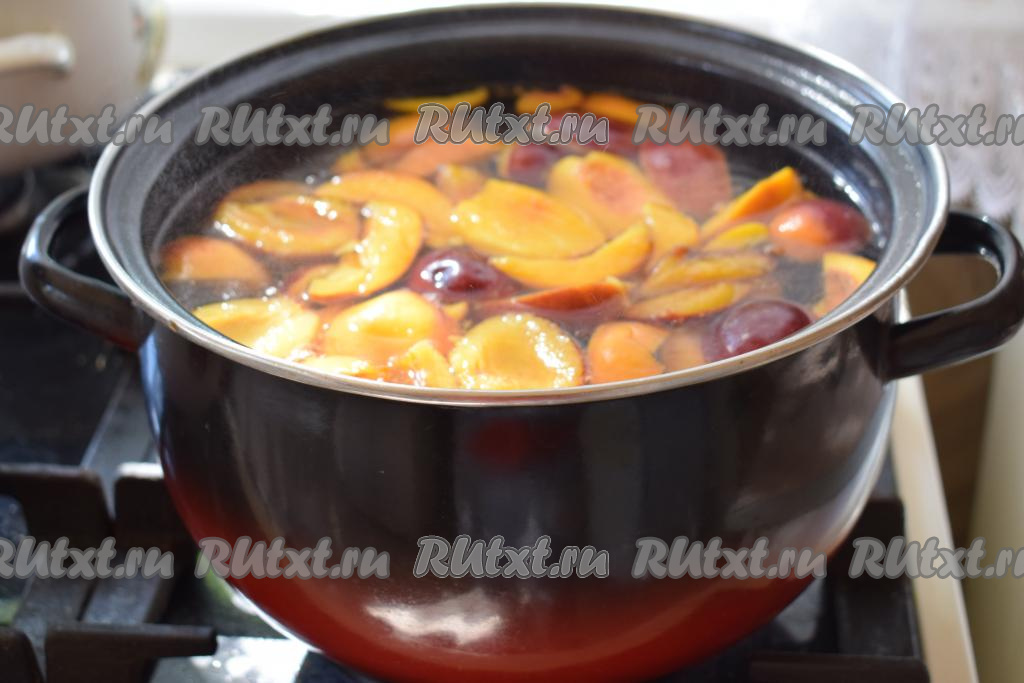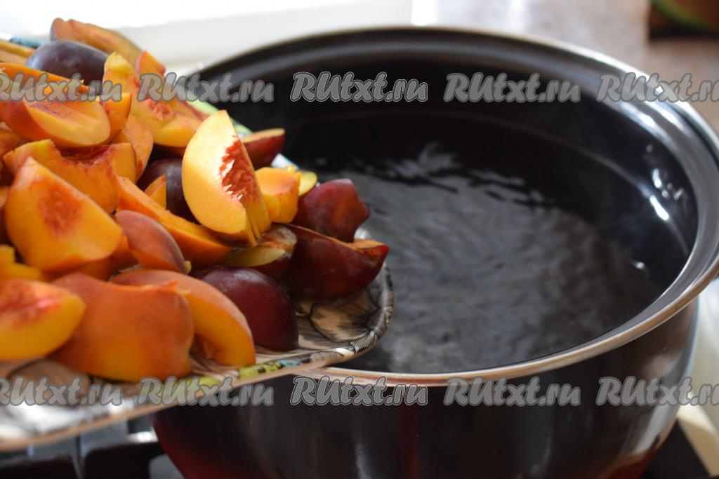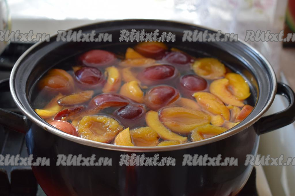 Варим сливово-персиковый компот на умеренном огне, примерно, 8 минут с момента закипания.