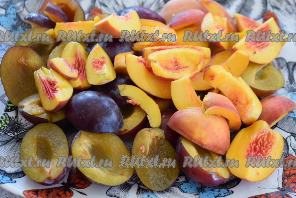 Нарежем сливы и персики на дольки, удаляя косточки.