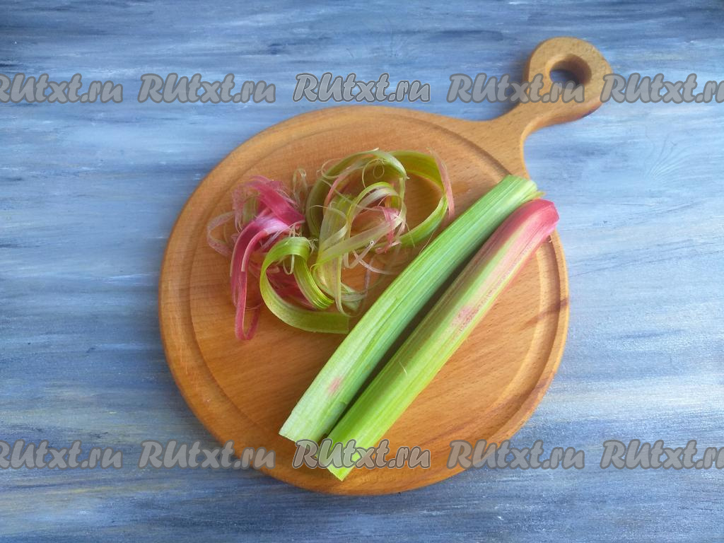 Стебли ревеня промыть в проточной воде, очистить стебельки по всей длине от шкурки.