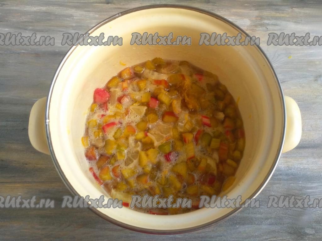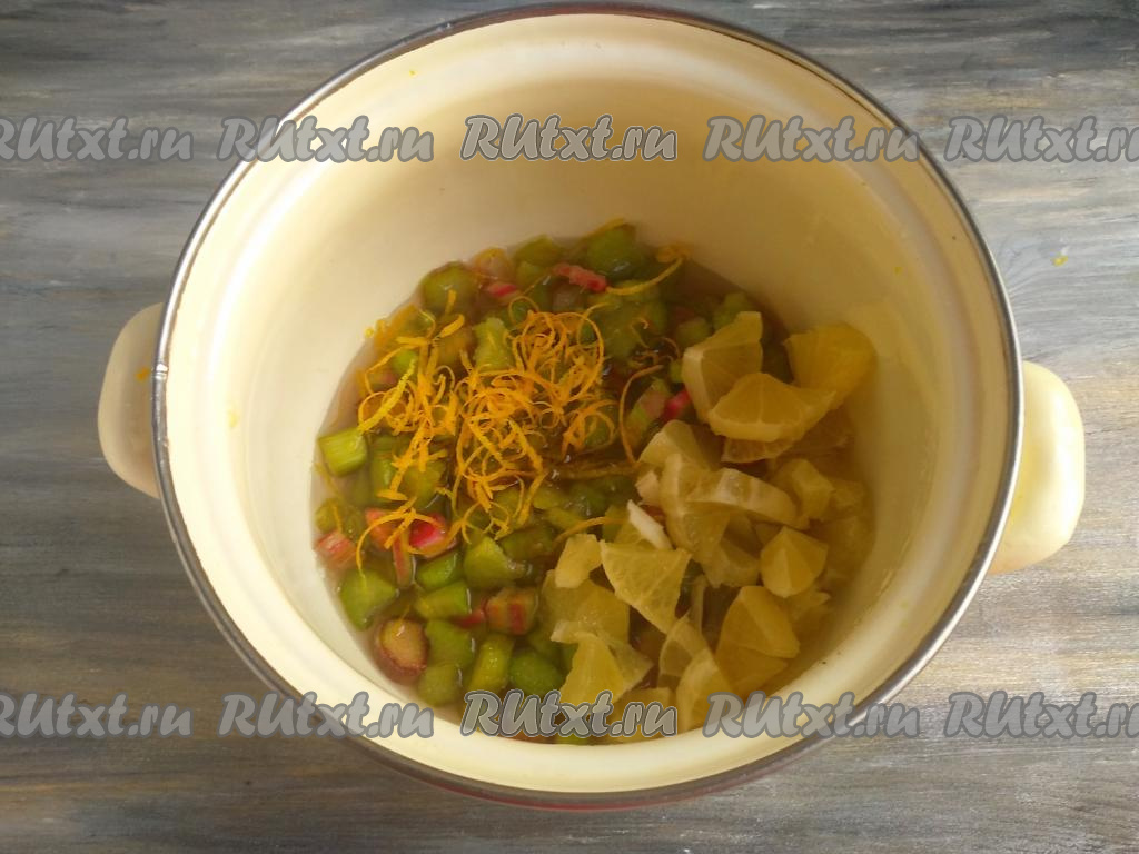 В эмалированную кастрюлю для варки варенья выложить ревень вместе с выделившимся соком, лимон и цедру.