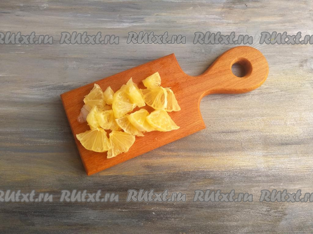 С лимона, очищенного от цедры, срезать белую кожицу и удалить из него косточки. Нарезать подготовленный лимон на небольшие кусочки.