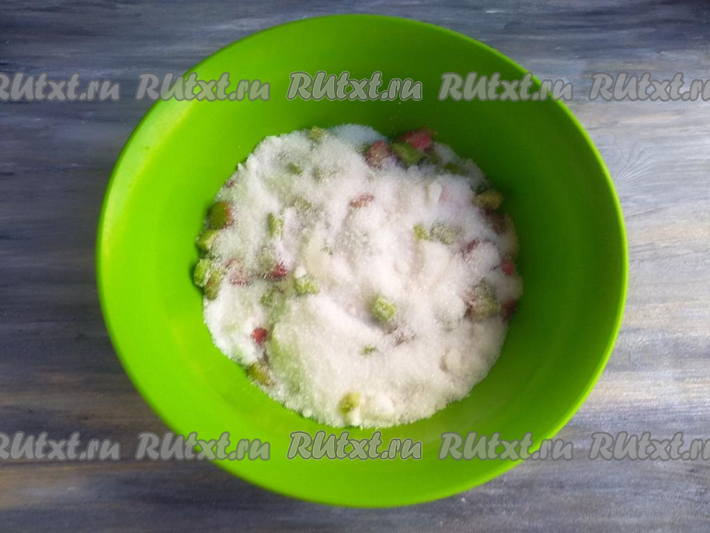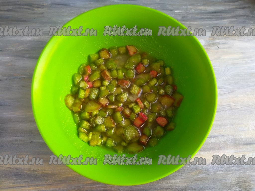 Выложить нарезанные стебли ревеня в миску, засыпать сахаром и оставить на 4-5 часов при комнатной температуре.