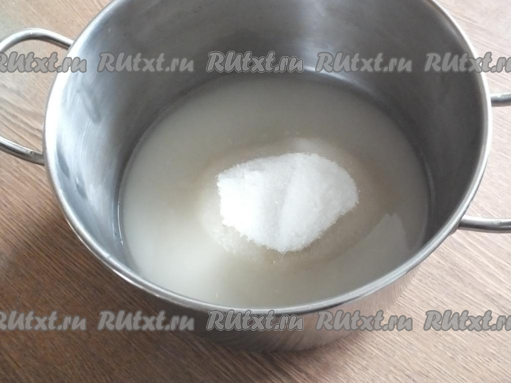 В глубокой кастрюле с толстым дном соедините сахар и воду, поставьте на огонь и доведите до кипения. Помешивая, проварите на среднем огне до полного растворения сахара. Уменьшите огонь до минимального.