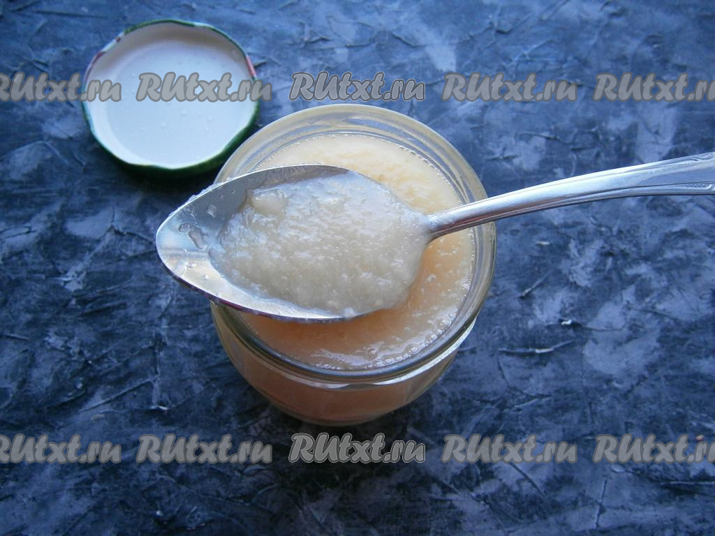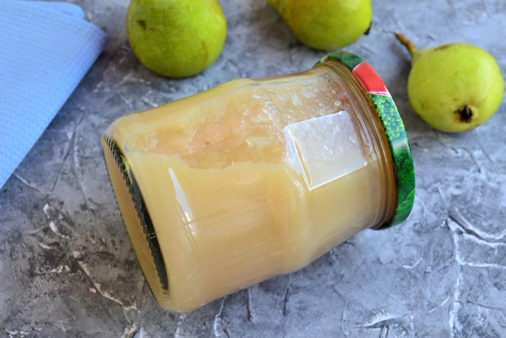 Грушевое пюре хорошо перемешать, довести до кипения на минимальном огне и, постоянно помешивая, проварить ещё 3-4 минуты. Выложить горячее грушевое пюре в простерилизованную, сухую баночку, закрутить прокипячённой крышкой.