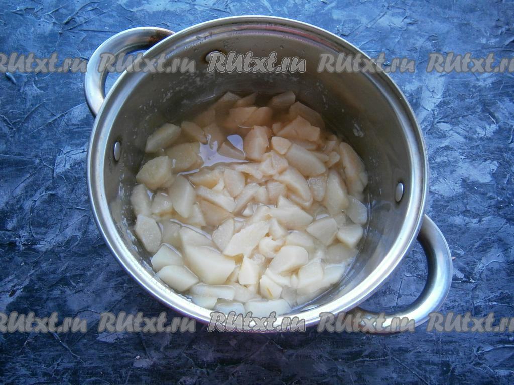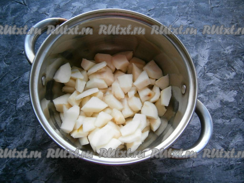 Удалить кожицу с груш, все повреждения и семена. Нарезать груши в кастрюлю кубиками (или дольками), влить воду.