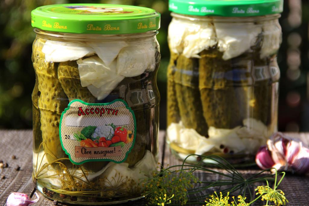 Вот такое красивое ассорти получилось. Зимой вкусные маринованные огурцы в сочетании с приятно похрустывающей капустой станут отличным дополнением к различным блюдам!