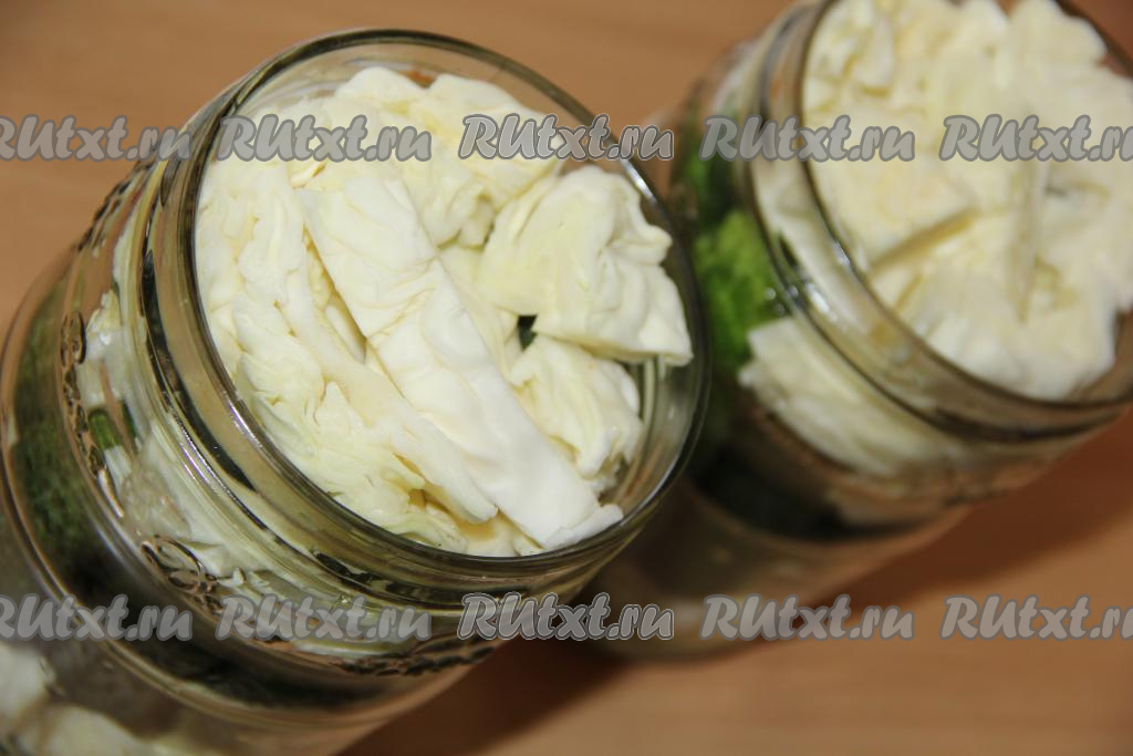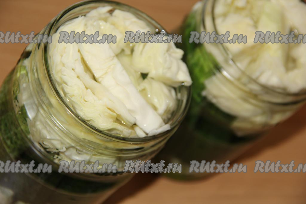 Поверх огурцов выложить оставшиеся дольки капусты.