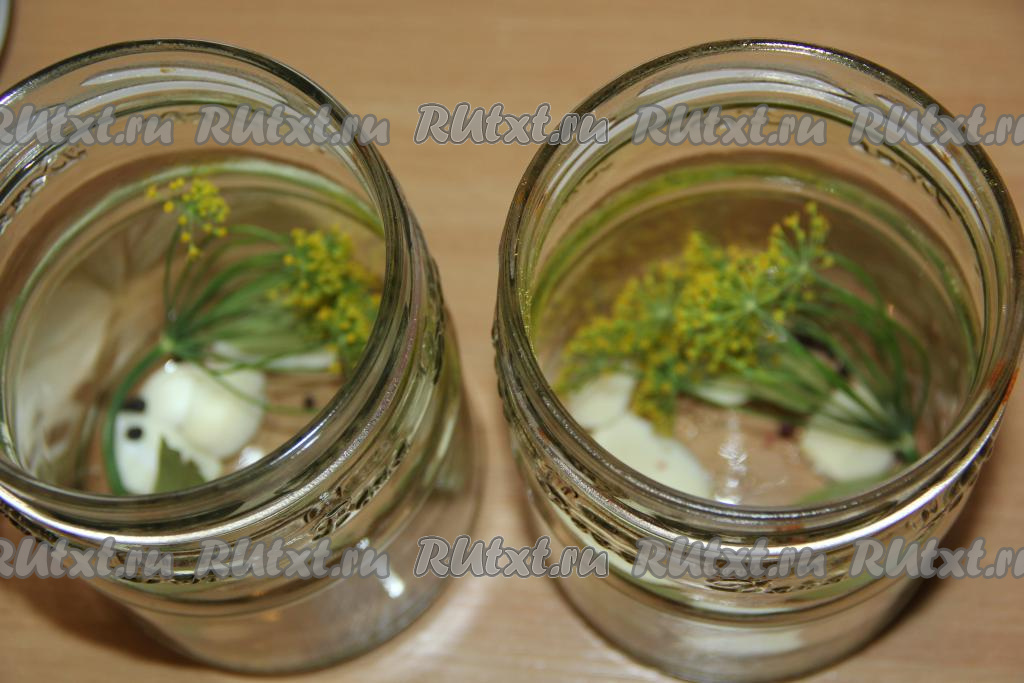 Баночки вымыть, а затем простерилизовать (я стерилизую в посудомойке). На дно каждой подготовленной банки выложить 3-4 очищенных и разрезанных на несколько частей зубчиков чеснока, 1 зонтик укропа, 1 лавровый листочек, 4-5 горошинок чёрного перца.