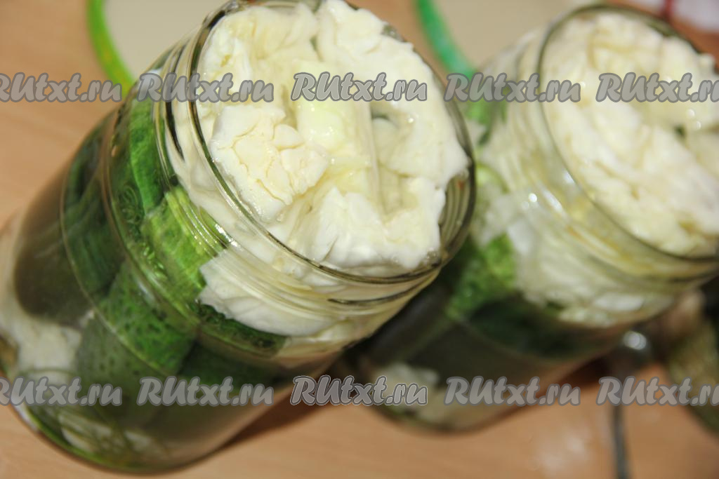 Залить банки с огурцами и капустой горячим маринадом до самого верха.