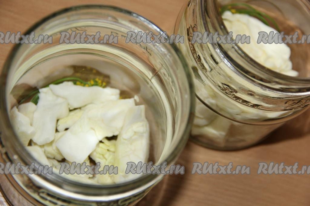 Капусту нарезать крупными дольками. Часть нарезанной белокочанной капусты выложить на дно банок.