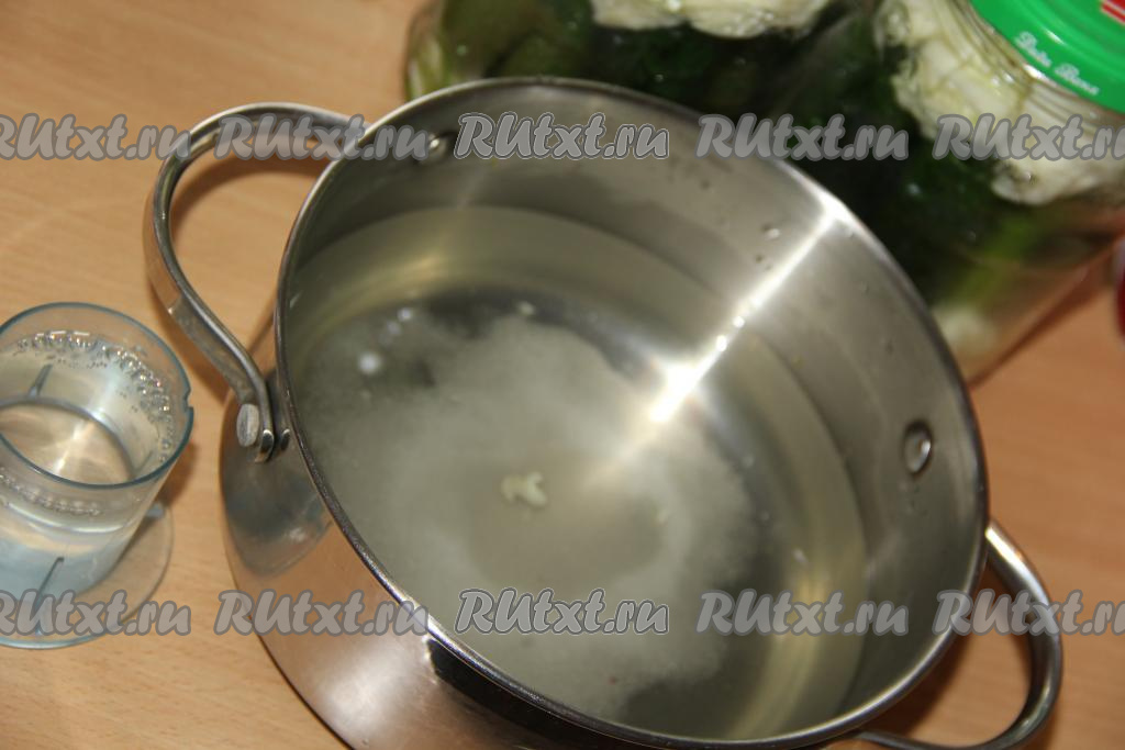 Содержимое кастрюли довести до кипения, а затем проварить 2-3 минуты, чтобы все кристаллики соли и сахара растворились, влить уксус, перемешать и снять маринад с огня.