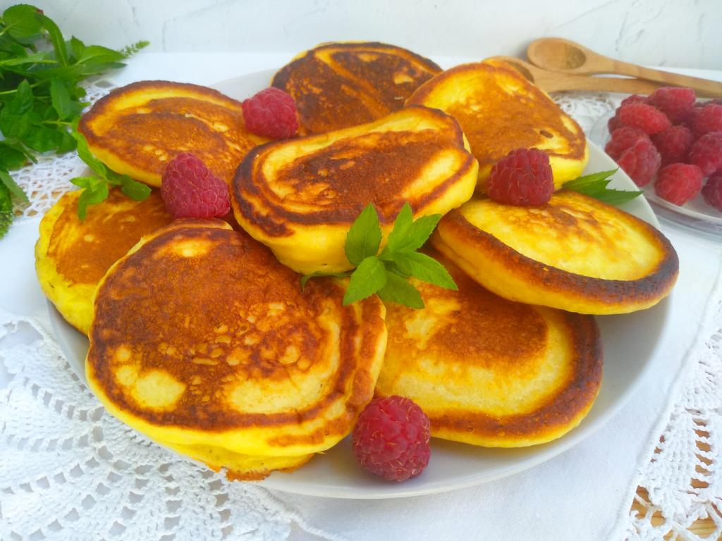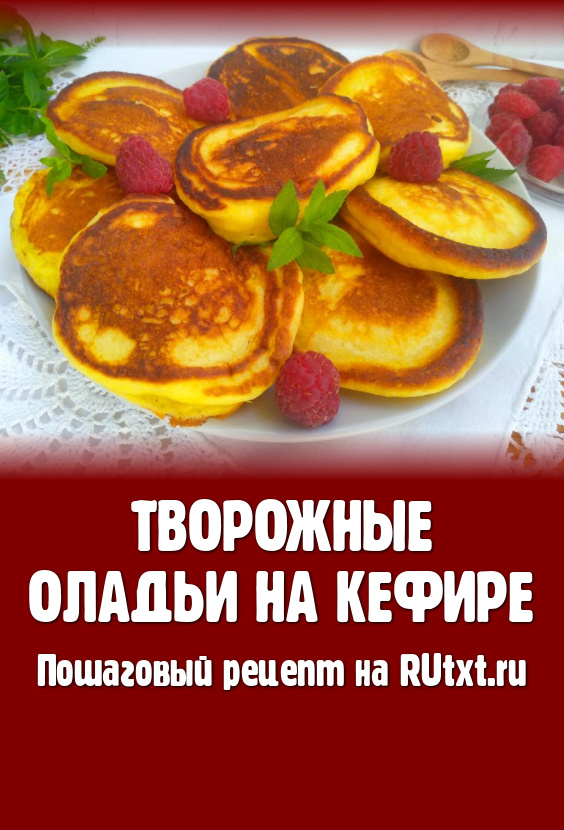 Творожные оладьи, замешанные на кефире, получаются пышными, вкусными, аппетитными. Переложить оладушки на тарелку для подачи, украсить свежими ягодами и веточками мяты. По желанию, изделия можно посыпать сахарной пудрой, дополнить мёдом или сгущённым молоком.