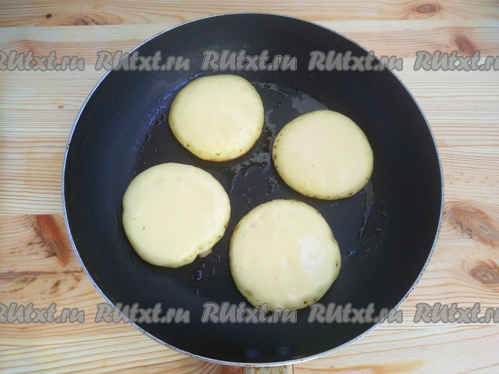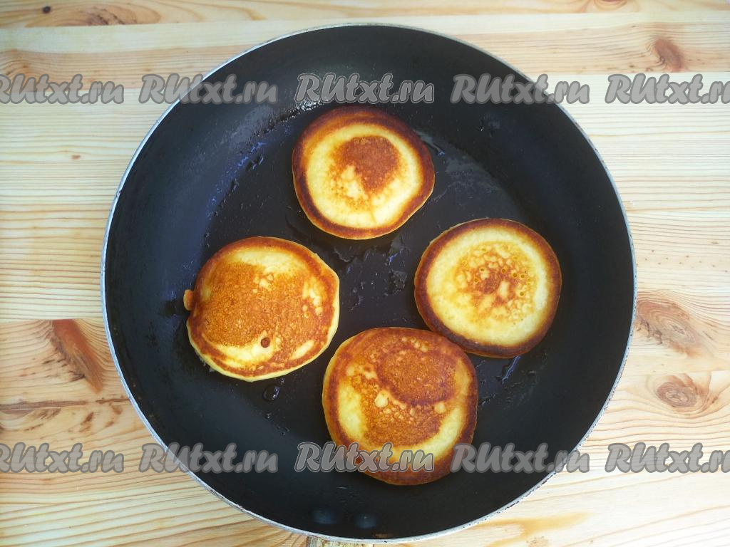 Затем перевернуть и жарить с другой стороны до румяной корочки (на это тоже уйдёт 1-2 минуты). Огонь убавить до минимума, накрыть сковороду крышкой и готовить ещё 1-2 минуты, затем переложить на тарелку. Таким образом пожарить все оладушки.
