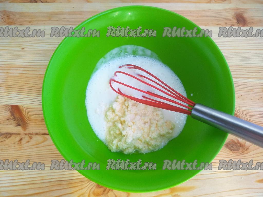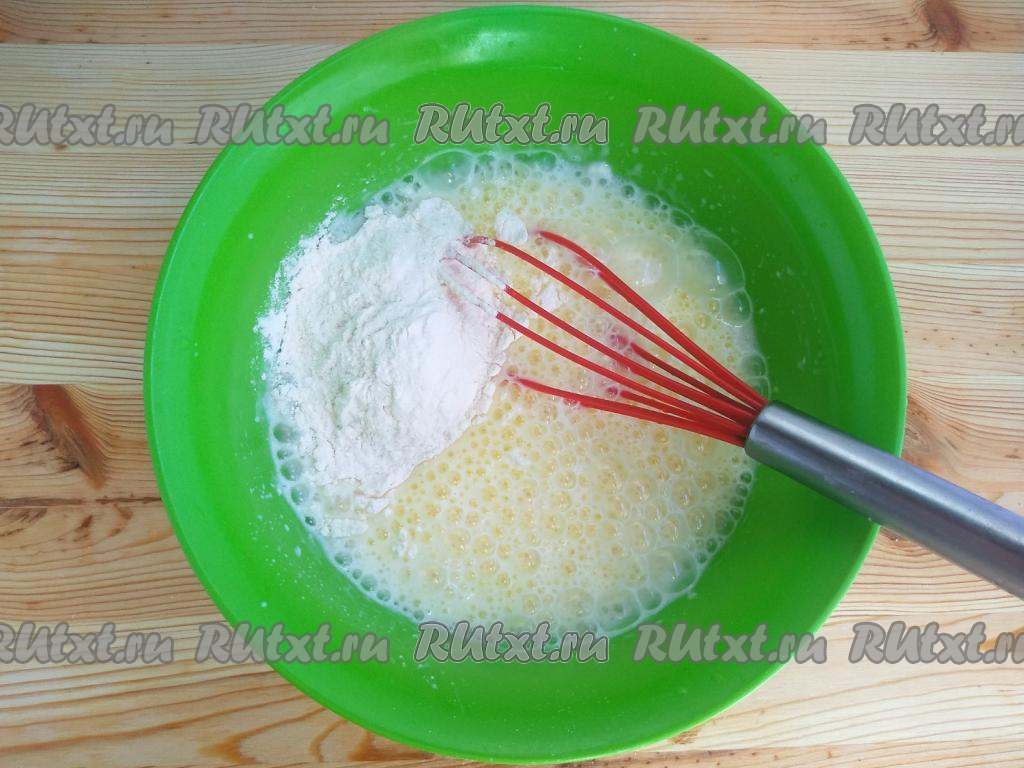 Добавить просеянную муку, тщательно перемешать венчиком, замешивая тесто.