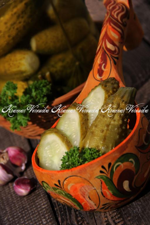 Хочу предложить рецепт приготовления на зиму малосольных, очень вкусных и хрустящих маринованных огурцов. Банки с такими огурчиками закрываются капроновой крышкой и прекрасно хранятся в течение всей зимы в погребе или прохладном месте. Когда с момента засолки по этому рецепту прошёл один месяц, я проверила, рассол не помутнел! При желании, несколько огурчиков можно достать из баночки вилкой, а оставшиеся огурцы снова закрыть крышкой. Я не удержалась и попробовала огурцы, даже сфотографировала в разрезе. Всем советую приготовить огурчики по этому рецепту!