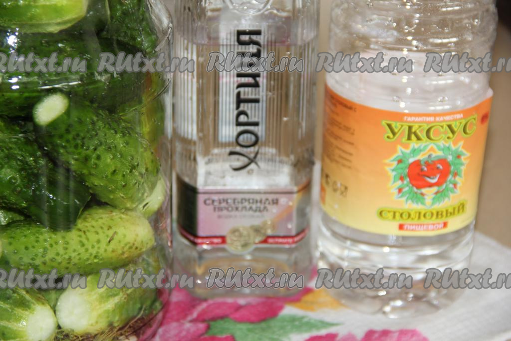 Как только соль растворится, снять кастрюлю с огня и влить уксус и водку, перемешать. Любой маринад с добавлением водки позволяет в результате получить хрустящие огурчики и, конечно, водка - это антисептик, а значит банки с такими огурцами не взорвутся и не забродят.