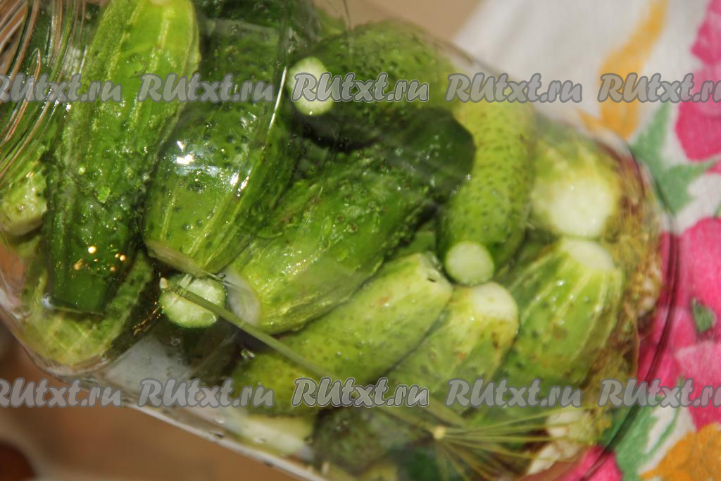 Огурцы предварительно замочить в холодной воде на сутки. Затем хорошо промыть огурчики и, отрезав попки с двух сторон, плотно выложить в банку.