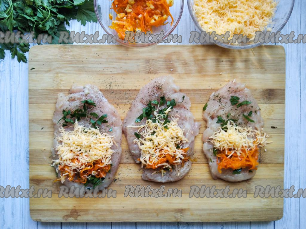 На каждый отбитый кусочек куриного филе выложить часть измельчённой петрушки, часть остывшей моркови, обжаренной с чесноком, и посыпать частью натёртого сыра.