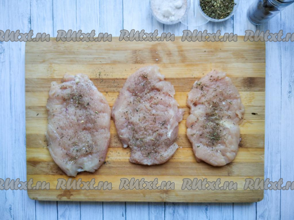 Посолить каждый отбитый кусочек мяса, посыпать специями по вкусу (я посыпала "Итальянскими травами").