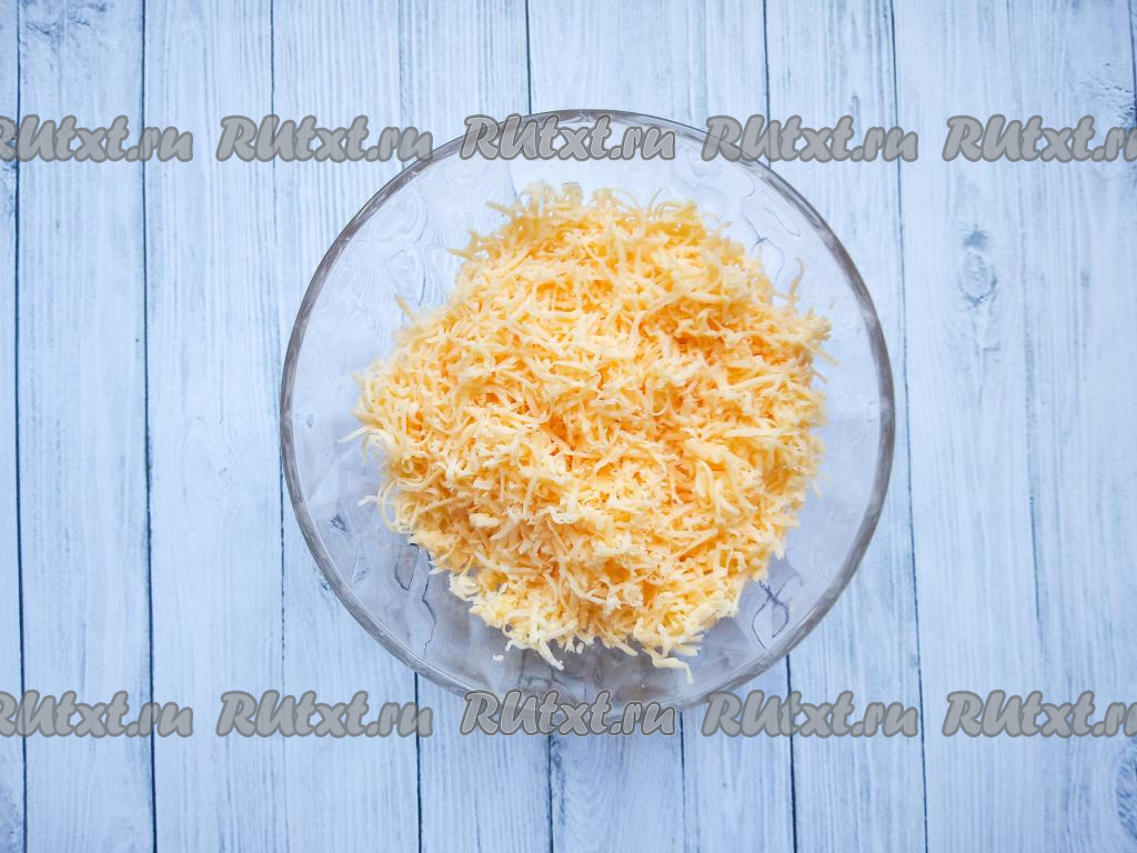 Натереть на мелкой тёрке сыр твёрдых сортов, затем разделить его мысленно на 2, примерно, равные части: часть сыра станет начинкой для рулетиков, а второй частью сыра будем посыпать куриные рулетики в конце запекания.