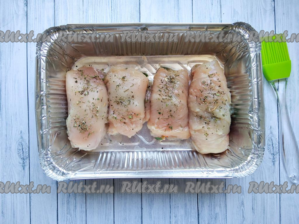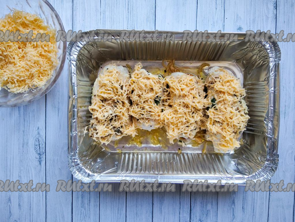 Затем достать форму для запекания из духовки, смазать рулетики из куриного филе майонезом, посыпать оставшимся твёрдым сыром и поставить в духовку на 5 минут.