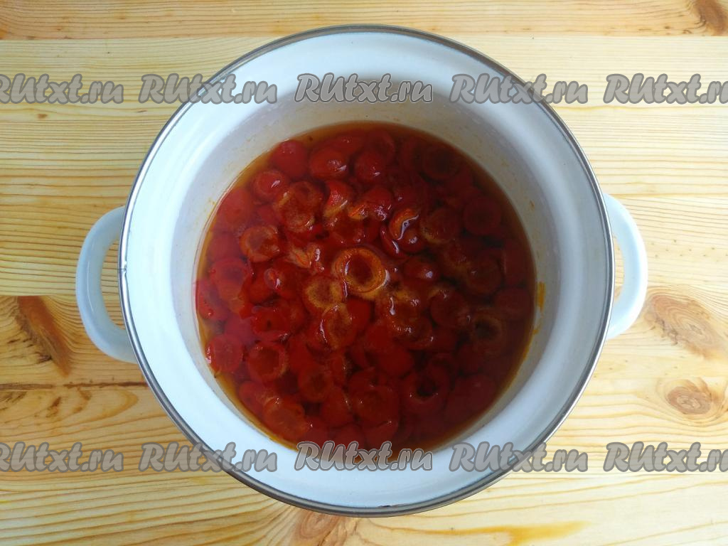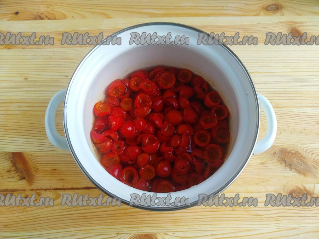 На следующий день ягоды промыть через дуршлаг, выложить в кастрюлю для варки варенья. Залить 100 мл холодной воды и, поставив на огонь, довести до кипения, затем варить 10 минут на минимальном огне.