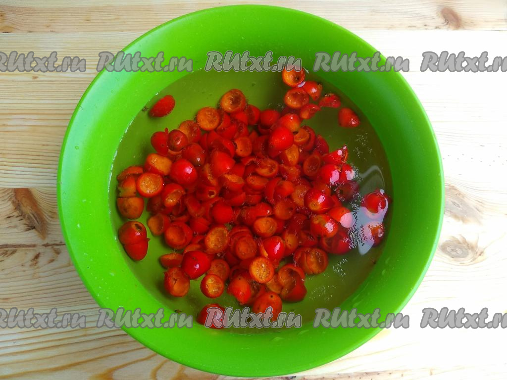 Обратной стороной чайной ложки или острым ножом удалить косточки и волоски из ягод. Я процедуру по очистке ягод делала в перчатках и вам советую!