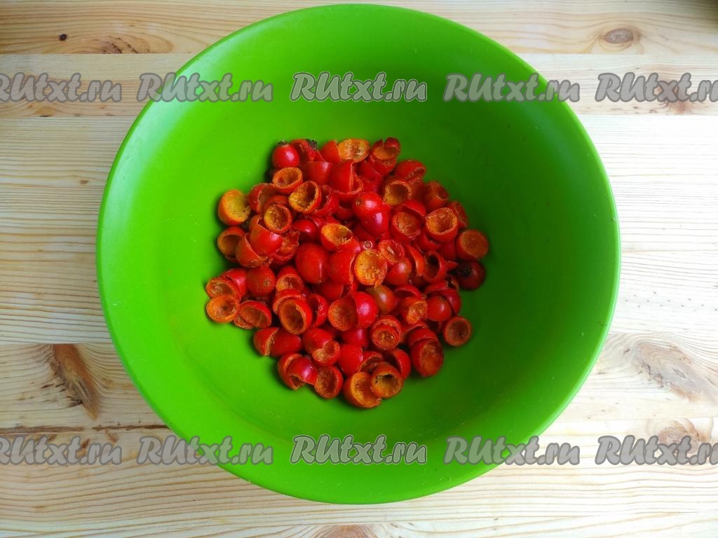 Выложить подготовленные половинки шиповника в миску (должно получиться 200 грамм очищенных ягод).
