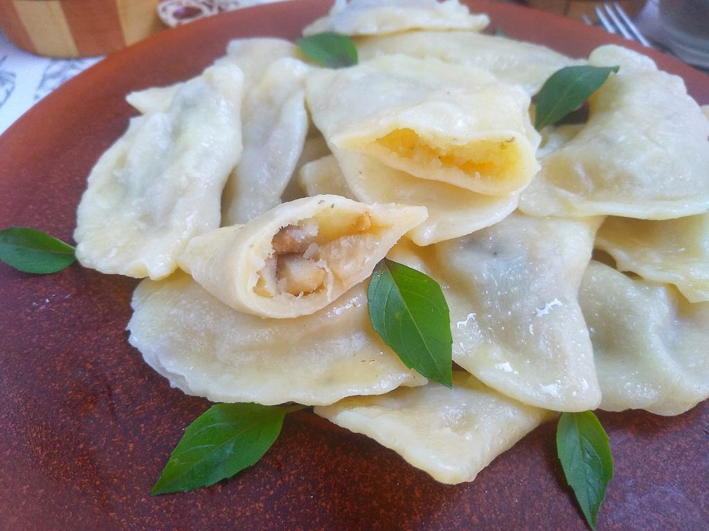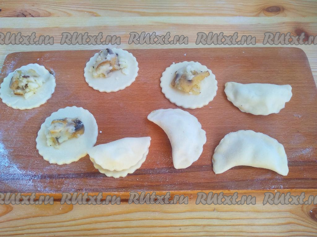 Выложить по 1 чайной ложке начинки в центр каждого кружка и крепко слепить края каждого кружочка, формируя вареник с картофельно-грибной начинкой.