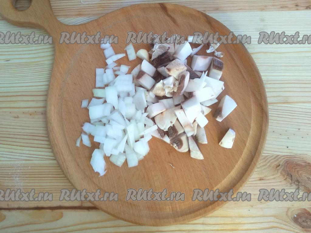 Шампиньоны вымыть, обсушить, нарезать небольшими кусочками. Лук очистить от кожуры, измельчить.