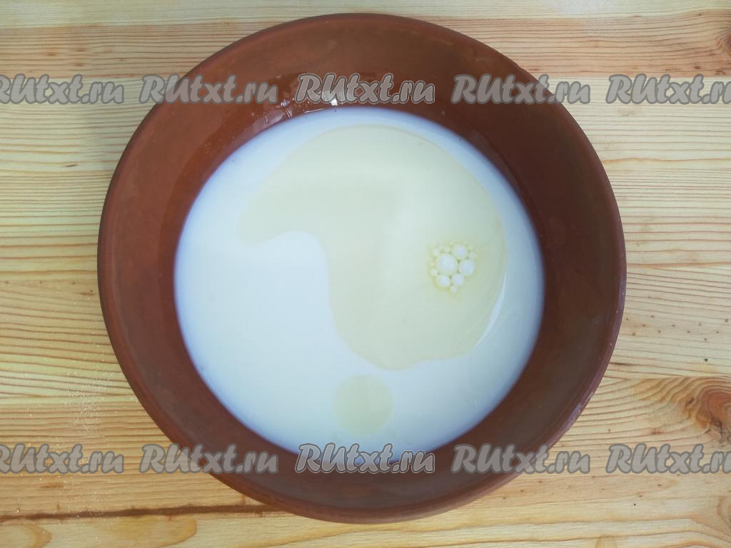 Вначале замесим тесто, для этого нужно вскипятить молоко, вылить его в миску, добавить растительное масло и соль.