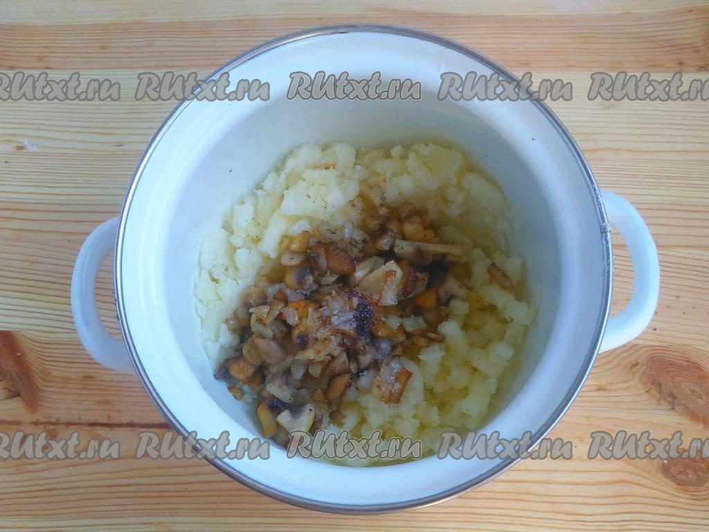 Выложить обжаренные шампиньоны с луком к картофельному пюре, посолить и поперчить по вкусу, перемешать, дать остыть и начинка для вареников готова.