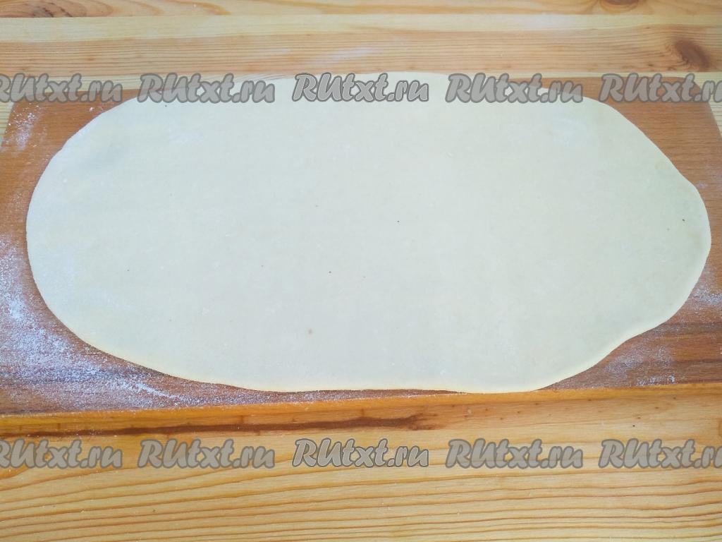 Тесто разделить на 2 части. Каждую часть теста на поверхности, припылённой мукой, раскатать в пласт толщиной около 2 мм.