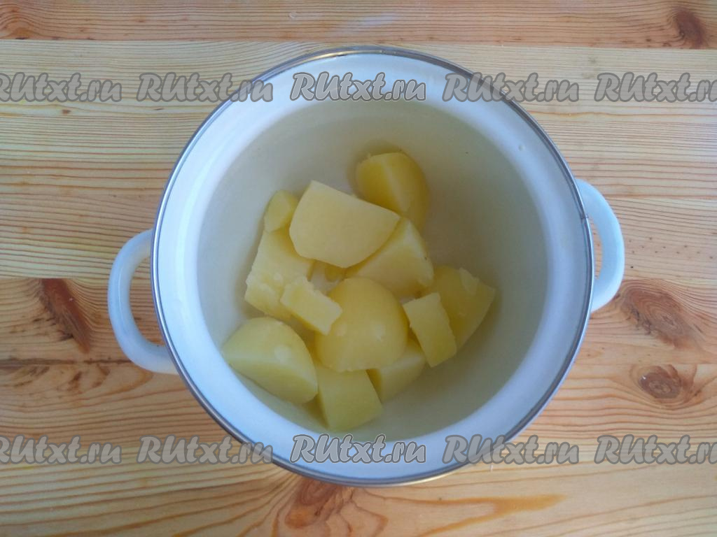 Теперь займёмся приготовлением начинки для вареников, для этого картофель нужно очистить от кожуры и разрезать на 4 части, а затем отварить в подсоленной воде до мягкости (на это потребуется 15-20 минут). Воду слить и растереть картошку с помощью толкушки в пюре.
