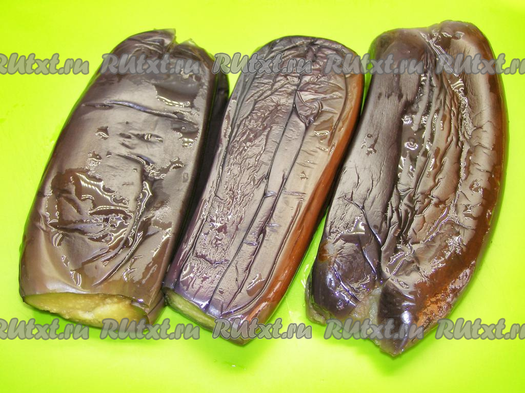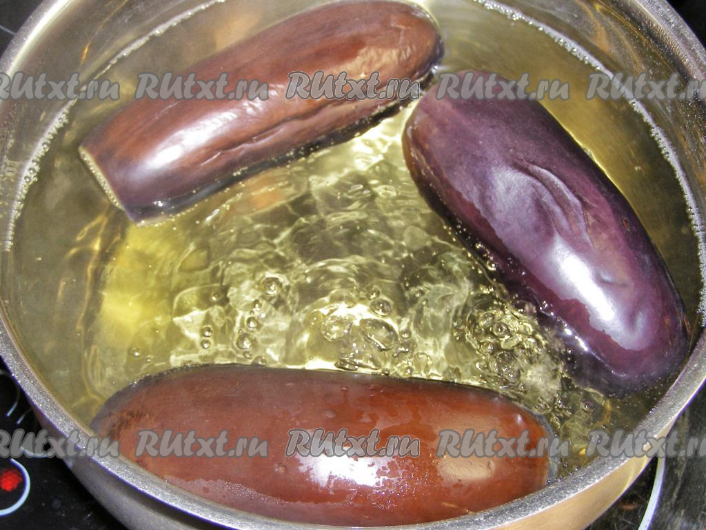 В кастрюлю наливаем воду, кладём соль (на 3 литра воды 1 столовая ложка соли) и доводим до кипения. В кипящую воду кладём баклажаны и бланшируем (варим) их, примерно, 5 минут на среднем огне. Затем перекладываем баклажаны в дуршлаг и оставляем минут на 5 (пока не стечёт вода).