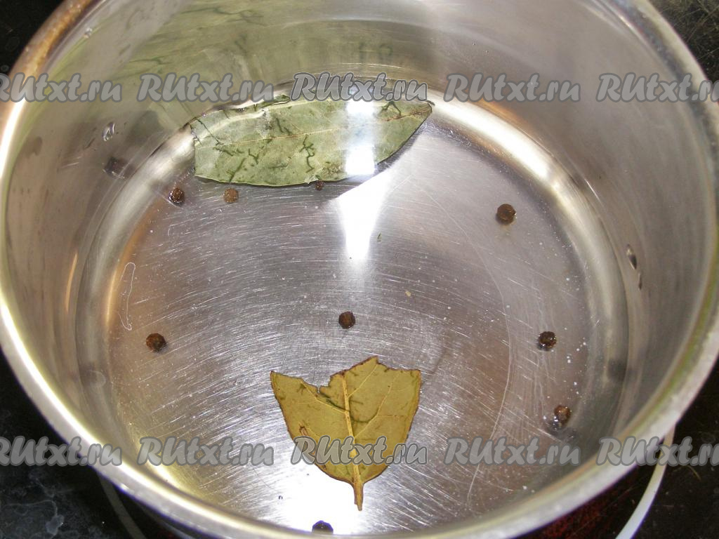 В 200 мл воды кладём лавровый лист, чёрный перец горошком, по желанию, добавляем душистый перец и гвоздику, даём воде закипеть. Варим 5-10 минут, затем добавляем уксус и ещё раз доводим до кипения, накрыв кастрюлю крышкой.