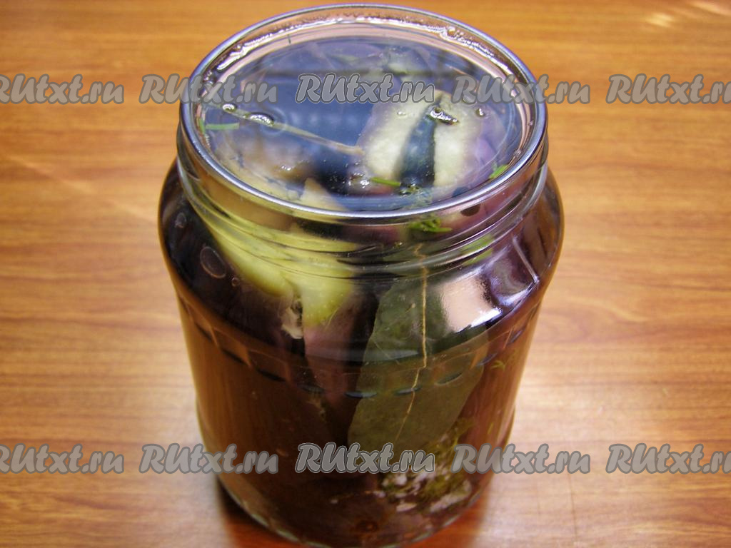 Заливаем баклажаны в банке кипящим маринадом вместе с приправами. Сразу закрываем прокипячённой крышкой и ставим вверх дном. Оставляем в таком виде остывать.