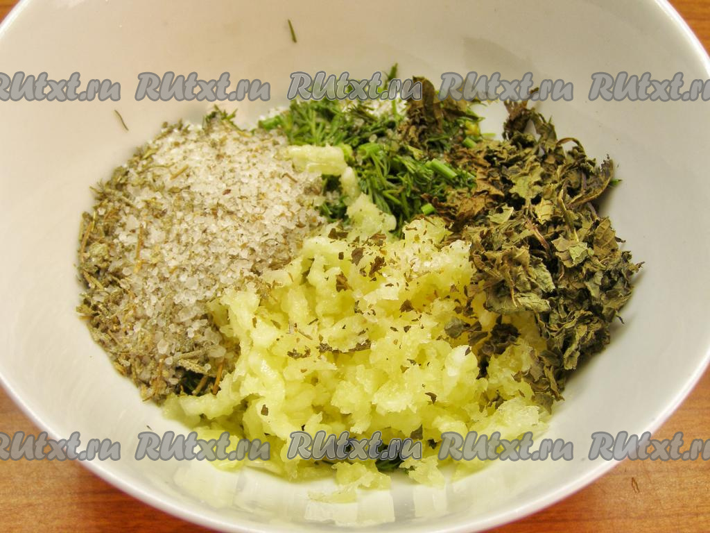 Перекладываем укроп в тарелку, добавляем сушёную (или свежую измельчённую) мяту, измельчённый чеснок и адыгейскую соль. Если у вас нет адыгейской соли, её можно заменить на обычную соль крупного помола или на морскую соль, добавив в неё (по желанию) приправы, например, сушёную петрушку, кориандр, чабер, базилик и чёрный молотый перец. Хорошо перемешиваем смесь зелени и чеснока.
