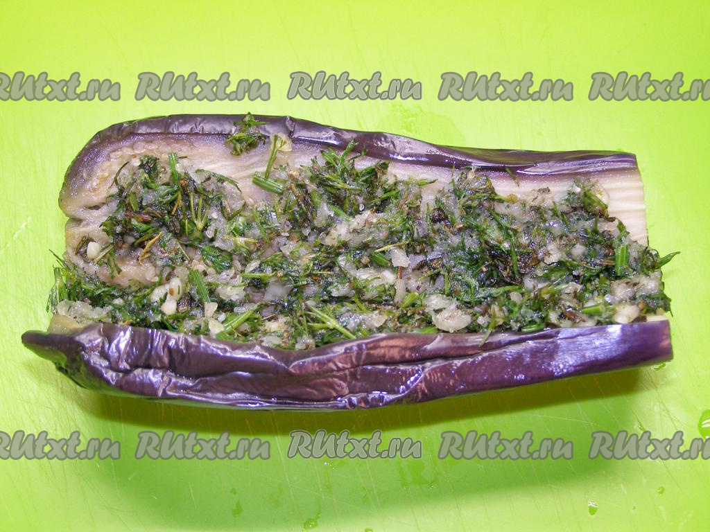 В разрез каждого баклажана кладём подготовленную смесь зелени и чеснока, равномерно распределяя эту начинку по всей длине. В таком виде уже можно кушать баклажаны по-грузински. Но мы будем их закрывать на зиму в маринованном виде, поэтому займёмся приготовлением маринада.