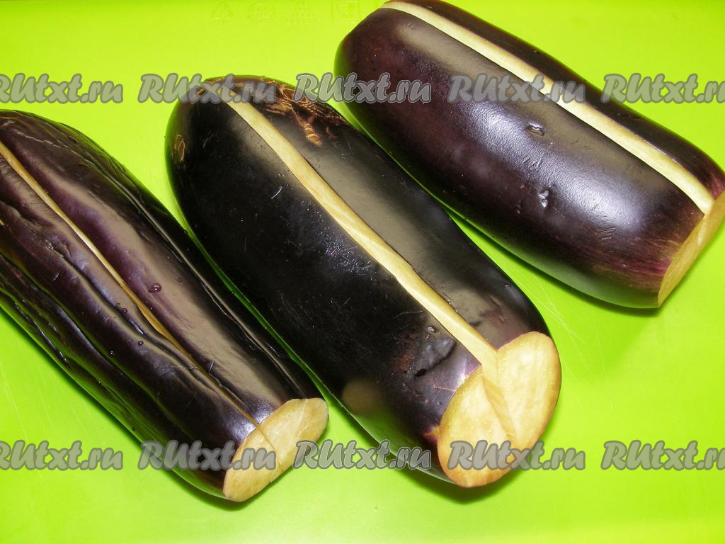Сначала подготовим баклажаны. Хорошо моем их в тёплой воде, отрезаем плодоножку и разрезаем каждый баклажан вдоль, не доходя до конца, примерно, 1 см (как на фото).