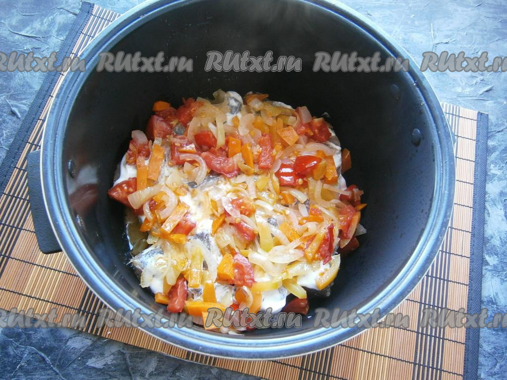Все овощи выложить поверх кусочков хека.