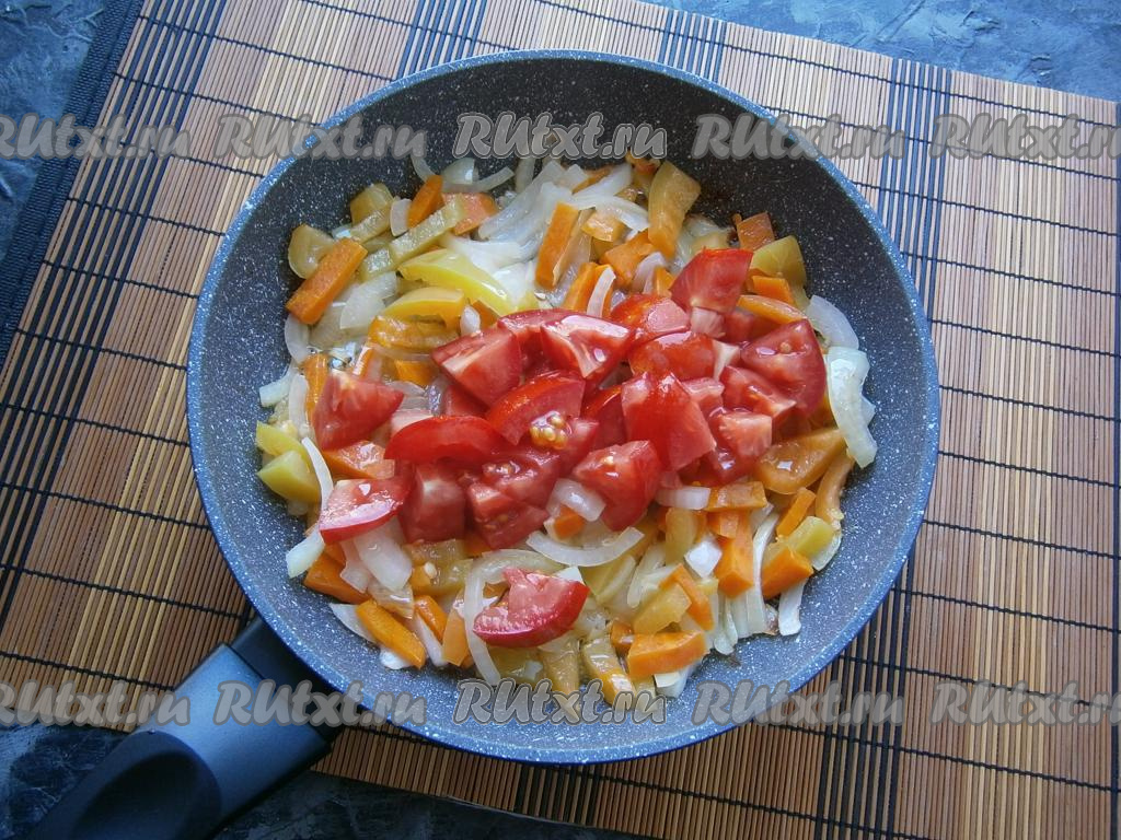 Обжарить овощи, помешивая, до мягкости и лёгкого зарумянивания, добавить нарезанные кубиками свежие помидоры, перемешать.