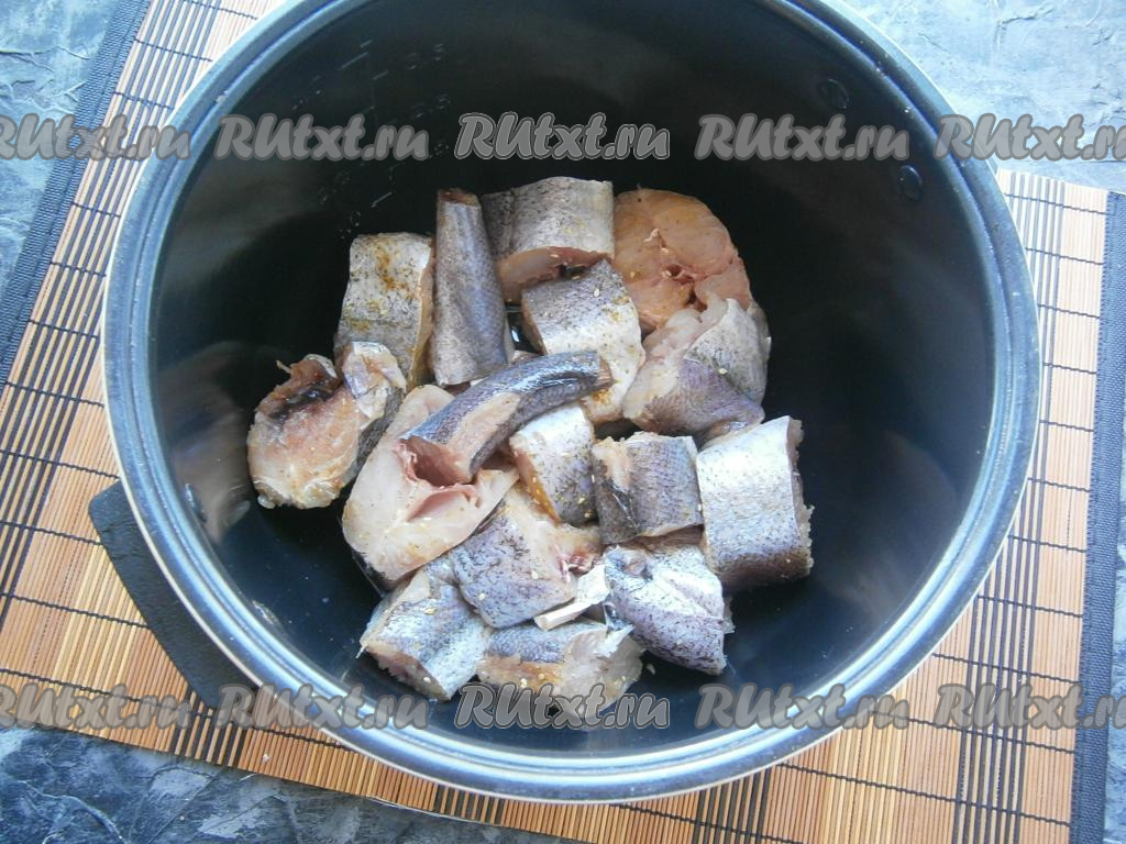 Хека разморозить, если неочищенный - очистить, отрезать плавники, удалить внутренности и чёрную плёночку из брюшка, хорошо промыть. Нарезать рыбу кусочками шириной около 3-4 см, посолить, посыпать специями, выложить в чашу мультиварки.