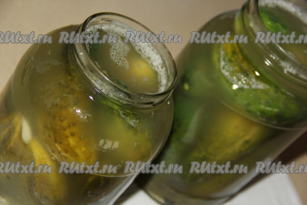 Залить банки с огурцами до самого верха горячим соляным раствором.