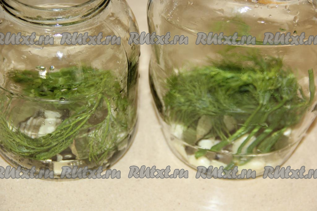 Банки простерилизовать любым способом. На дно банок выложить специи: перец (чёрный и душистый), очищенные зубчики чеснока, лаврушку, листья хрена и смородины, можно добавить веточки укропа.