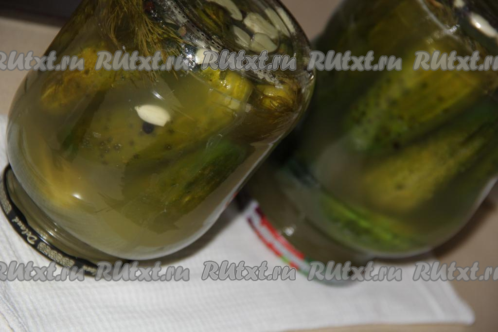 Закрыть простерилизованными крышками (я прокипятила крышки в течение 3 минут). Перевернуть баночки с огурчиками вверх дном, со всех сторон укутать в одеяло и оставить укутанные банки до полного остывания.