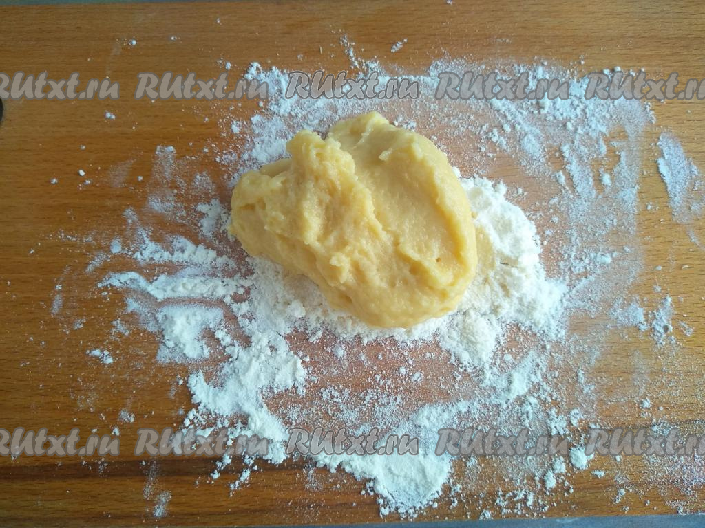 На дощечку насыпать муку. Выложить 30-35 грамм теста, обвалять его в муке, придавая тесту округлую форму.
