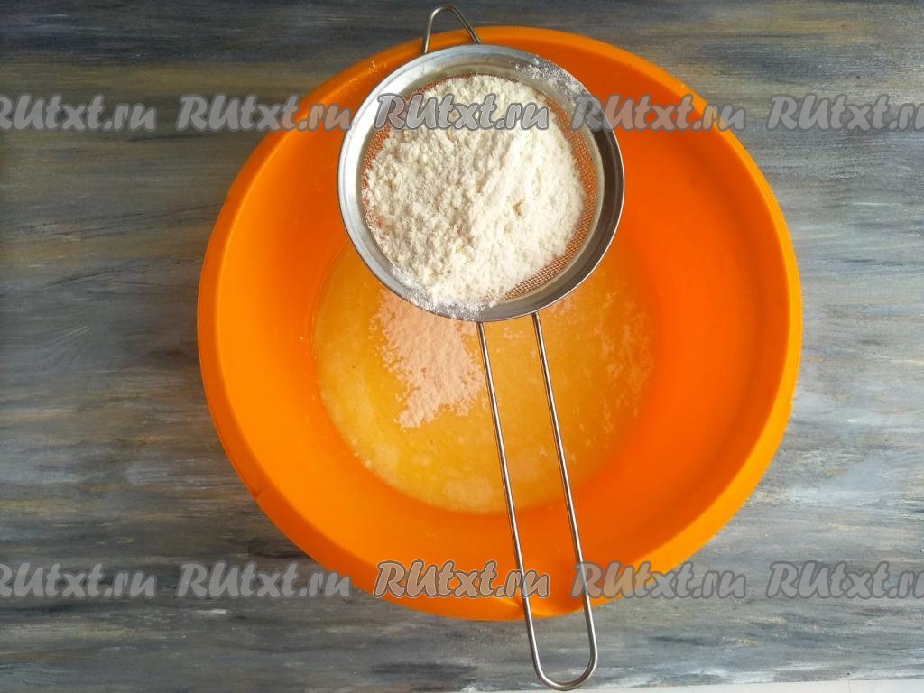 Всыпать разрыхлитель, ванилин и просеянную муку, перемешать лопаткой (или ложкой), замешивая липкое тесто.