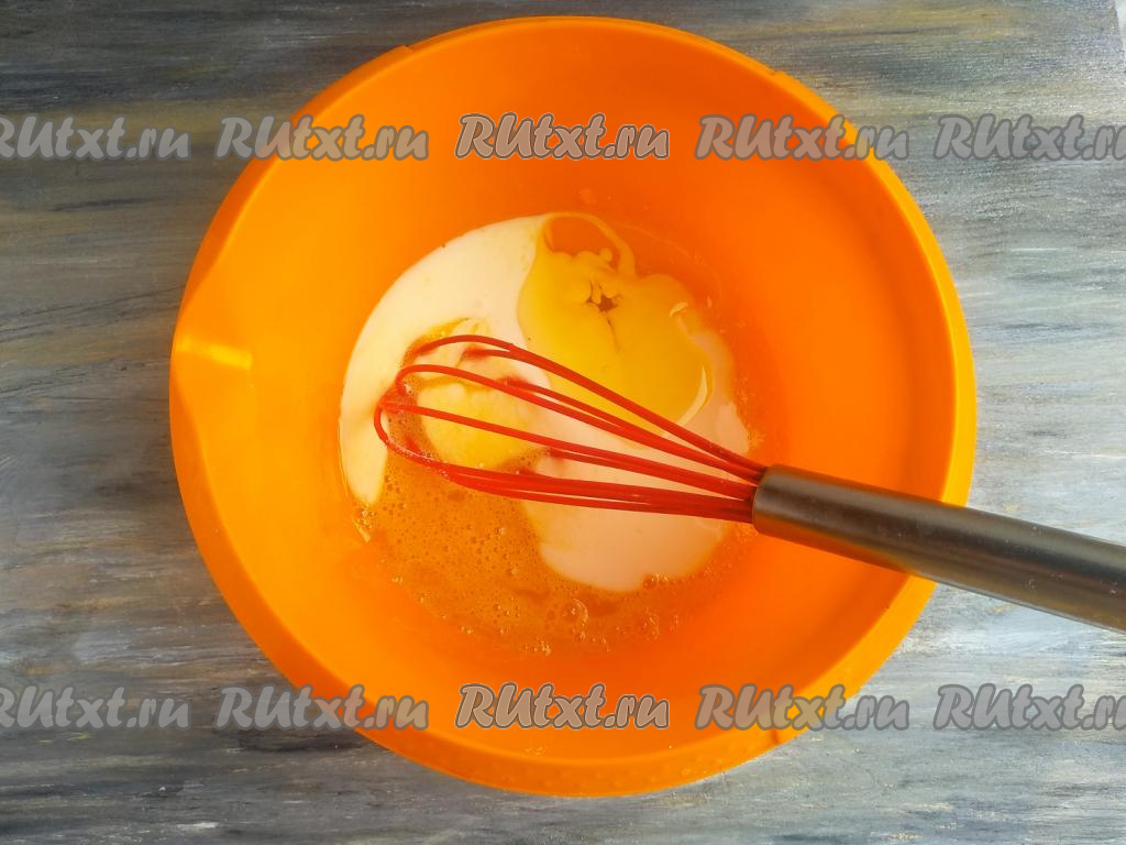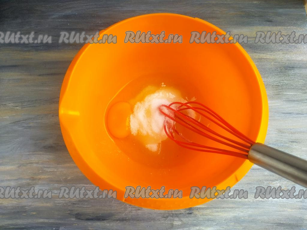 В миску всыпать сахар, вбить яйцо, взбить смесь венчиком.
