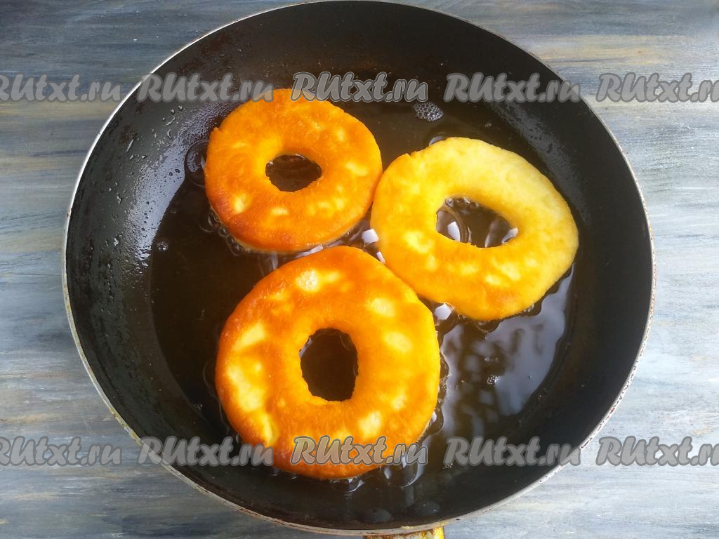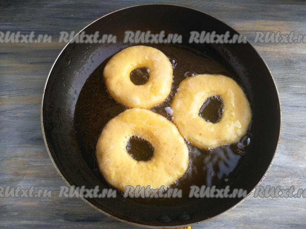 Обжарить пончики с 2-х сторон до румяности на среднем огне.